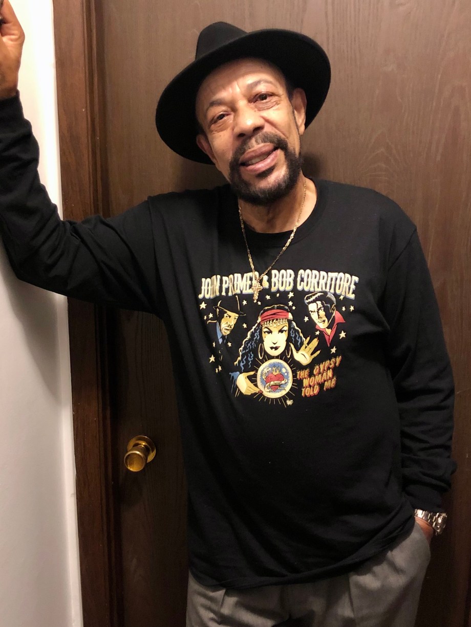 John Primer wearing his Gypsy Woman Told Me long sleeve T-shirt. Photo by Lisa Becker Primer.