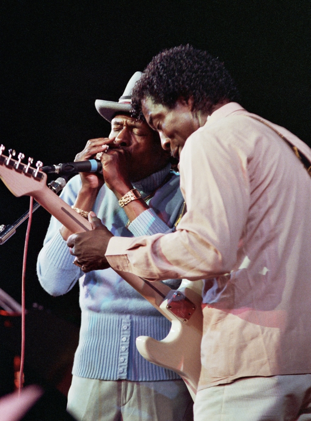 Junior Wells with Buddy Guy at the Birmingham Jazz Festival in 1989 (in Birmingham Town Hall). Photo by Brian Smith.
