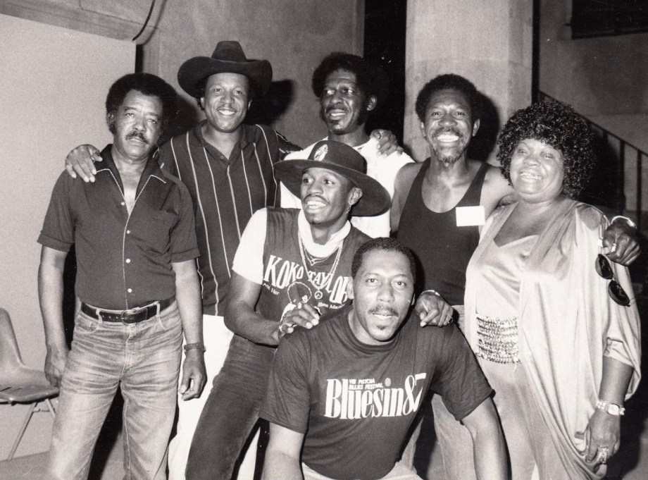 L-R: Jimmy Johnson, Lonnie Brooks, Bernard Allison, Eddie C. Campbell, John Watkins, Luther Allison, Koko Taylor. Photo 1987 by Tano Ro.