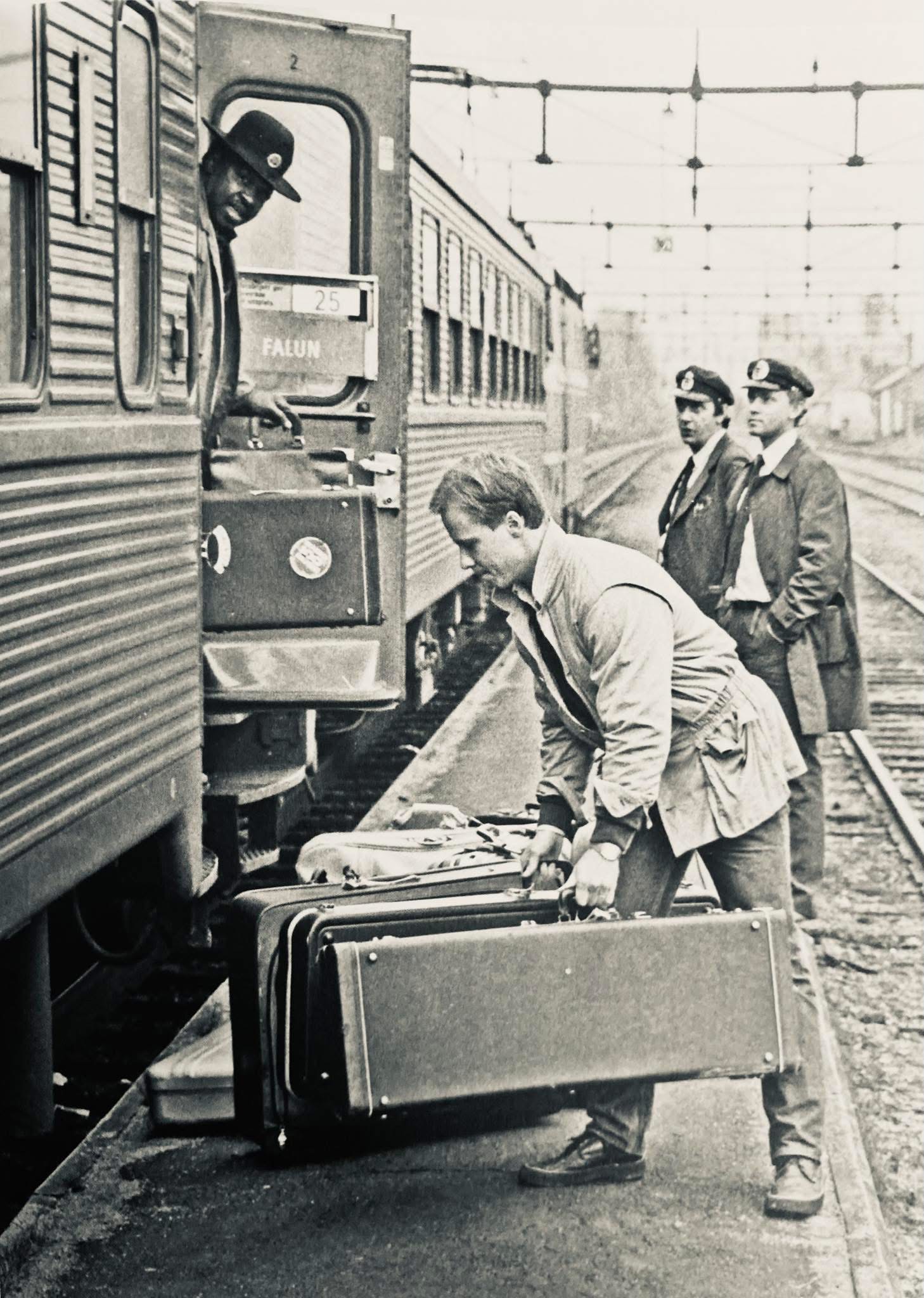 Magic Slim touring Sweden in 1982. Here he is leaving the train with help from Nils Hansson of the Gothenburg Blues Association. Photo Erik Lindahl.