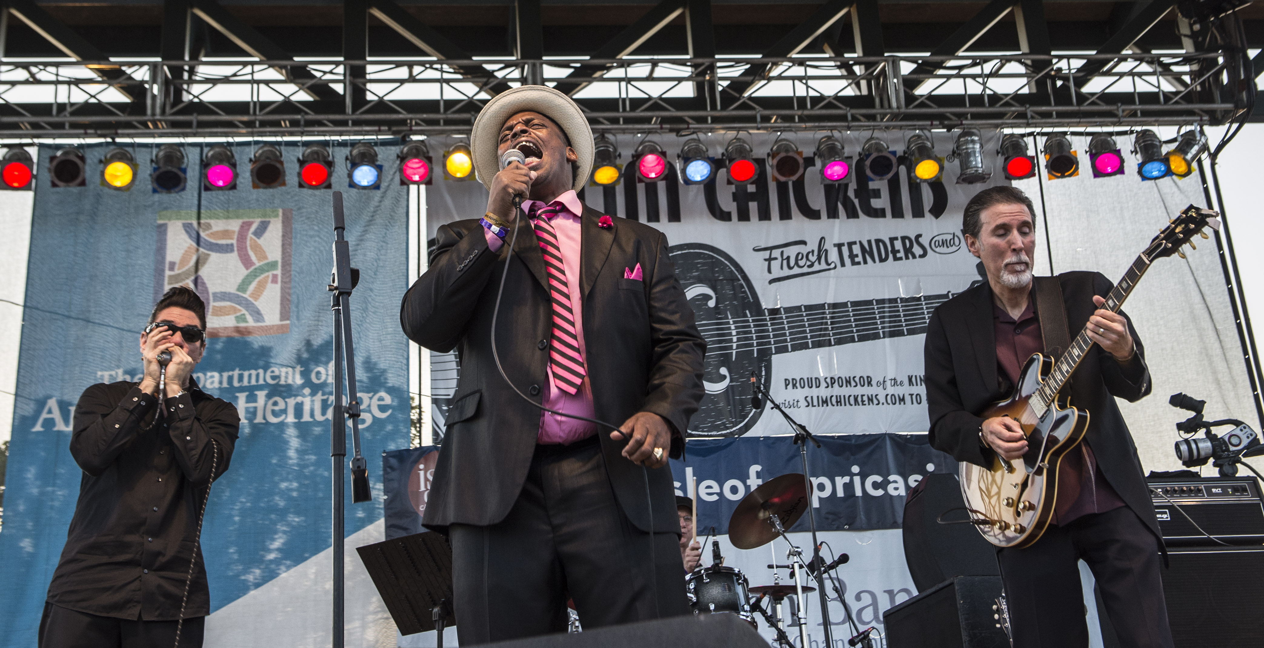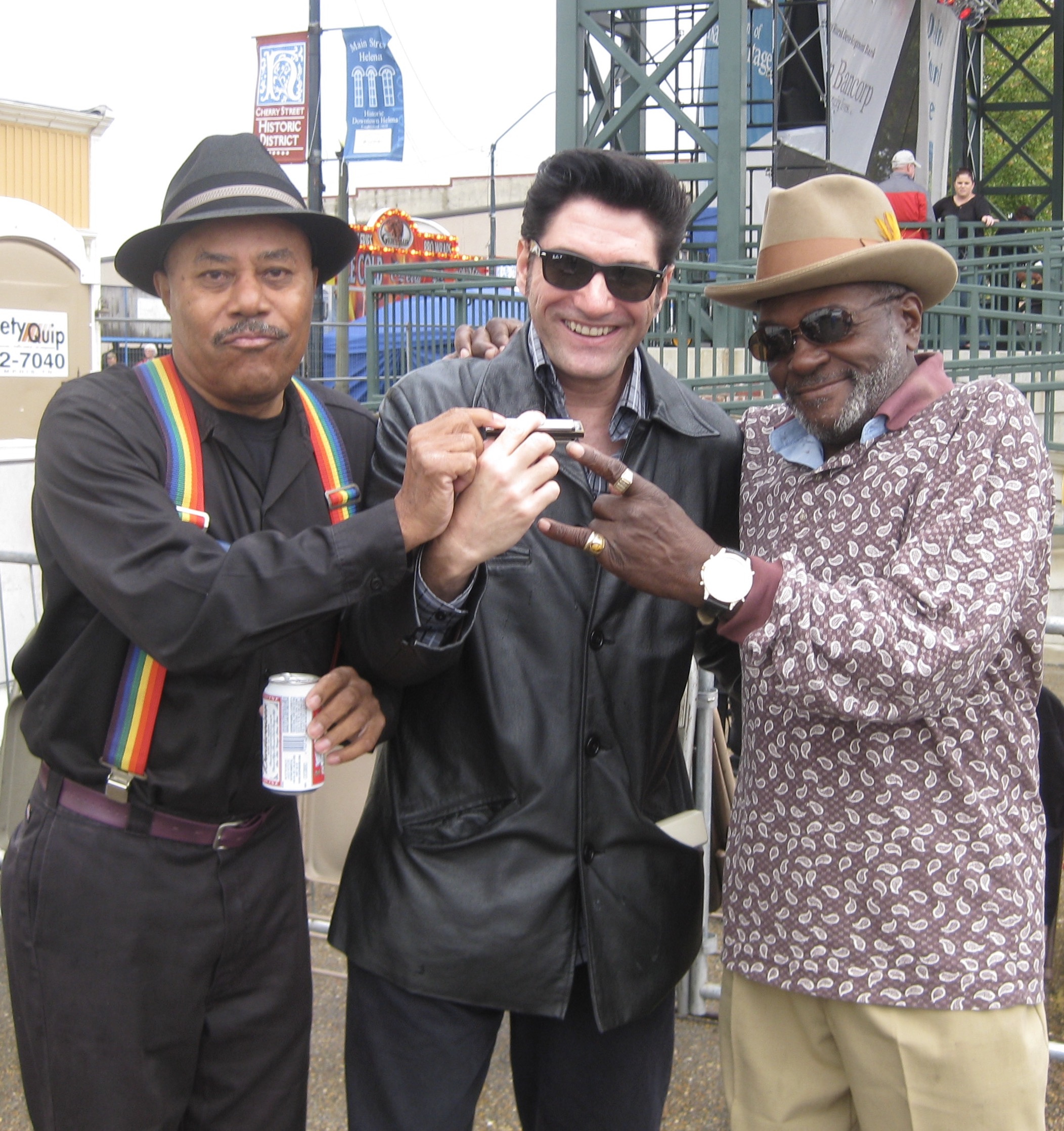 Bob Corritore, Alabama Mike, Andy T at the King Biscuit Blues Festival. Photo by Marilyn Stringer.