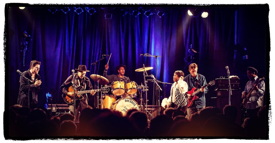 Bob Corritore, John Primer, Willie Hayes, Peaches Staton, Billy Flynn, Melvin Smith performing somewhere in France during the 2012 Chicago Blues Festival tour.