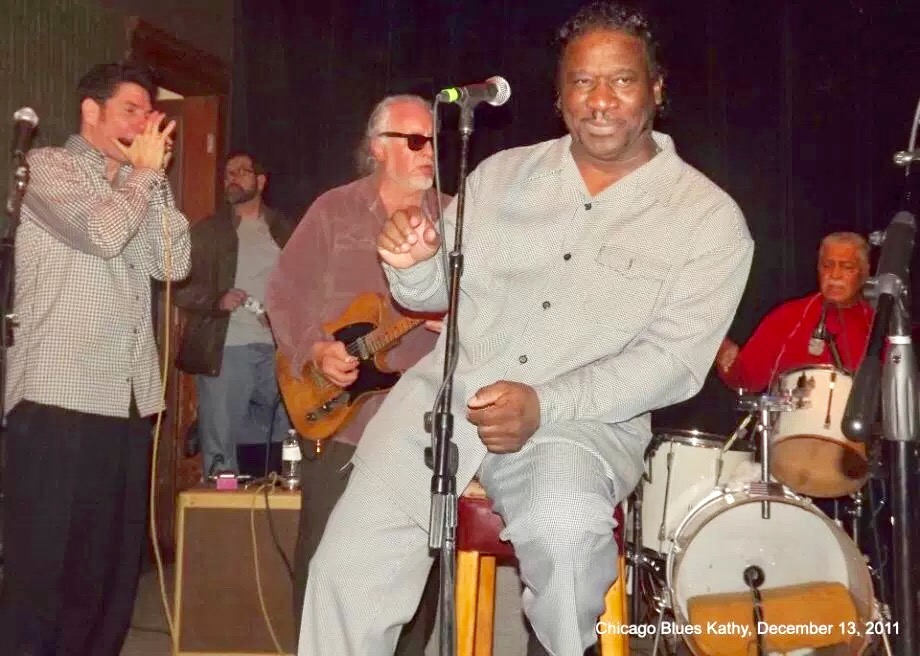Bob Corritore, Hugh Souther, Bob Margolin, Mud Morganfield, Sam Lay at Fitzgerald for the Hubert Sumlin celebration of life on December 13, 2011. Photo by Blues Kathy.