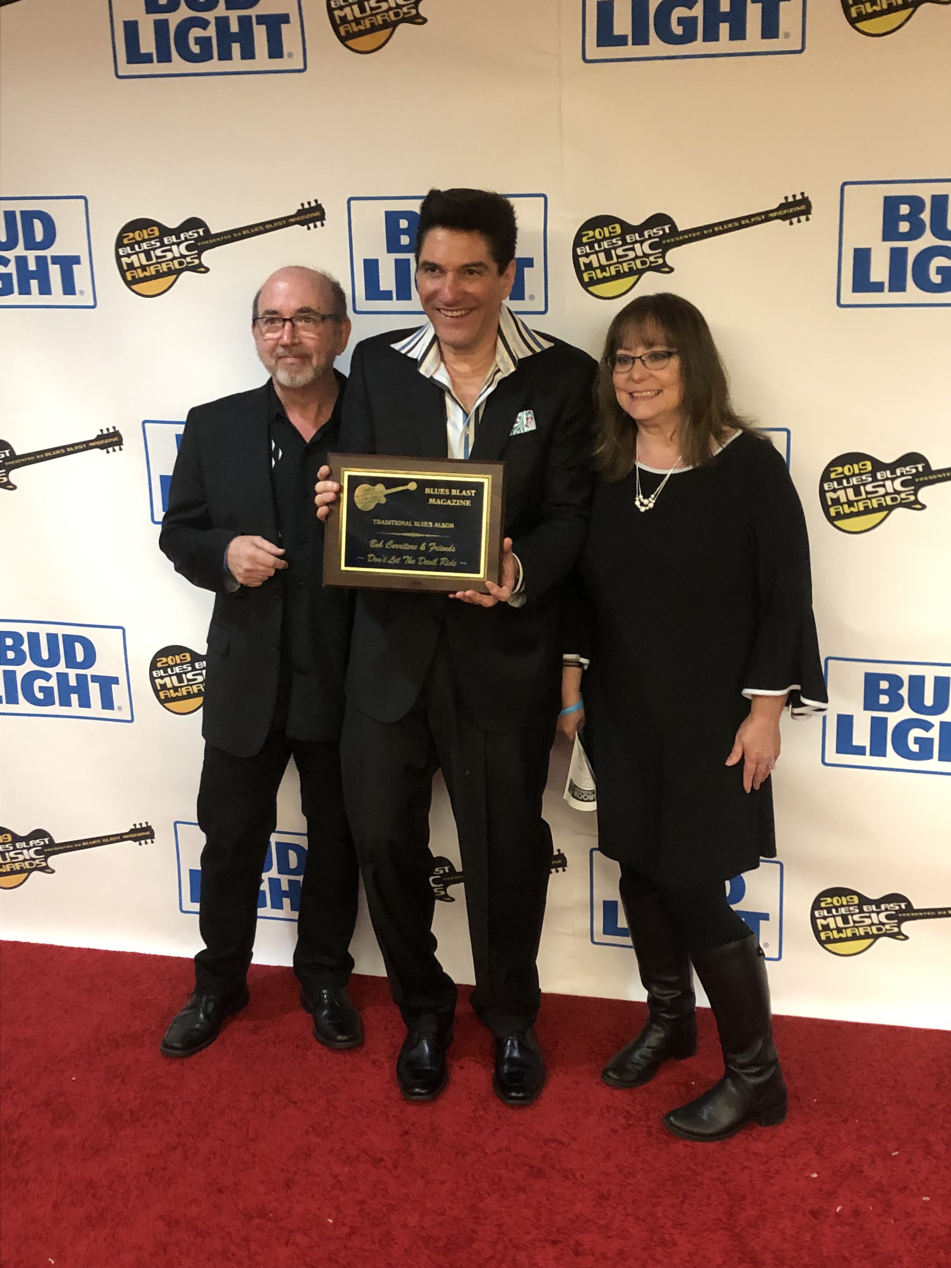 Bob Corritore holding up the Blues Blast Music Award with Richard Rosenblatt (VizzTone Label Group) and Amy Brat (BratGirl Media) at the awards ceremony. Photo Lisa Primer.