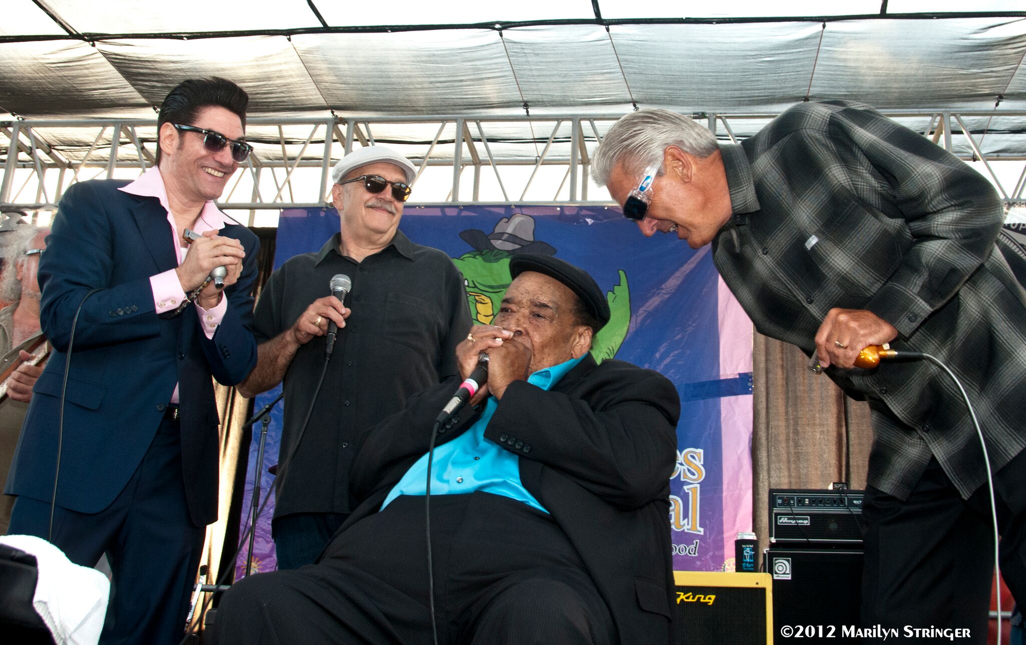 Bob Corritore, Darrell Nulisch, and Rod Piazza celebrate the amazing James Cotton! This was part of a Muddy Waters tribute sat at the 2012 Simi Valley Cajun & Blues Festival. Photo by Marilyn Stringer.