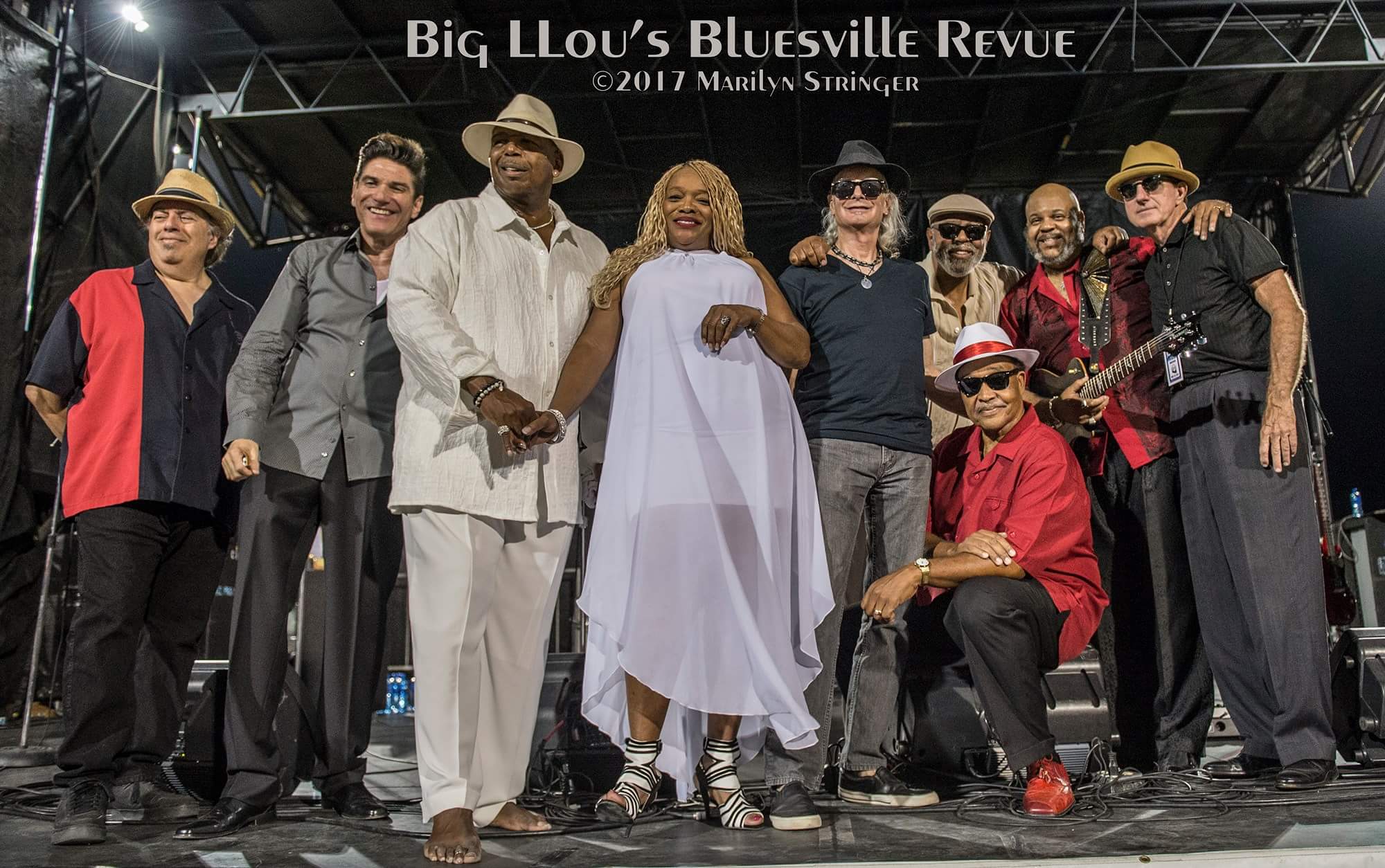 Big Llou’s Bluesville Revue at the 2017 Southern Arizona Blues Heritage Festival. Left to right: Larry Lermer, Bob Corritore, Big Llou Johnson, Nellie “Tiger” Travis, Doc Holiday, Zac Harmon, Johnny Rawls, Jimi “Primetime” Smith, Brian Fahey. Photo by Marilyn Stringer.