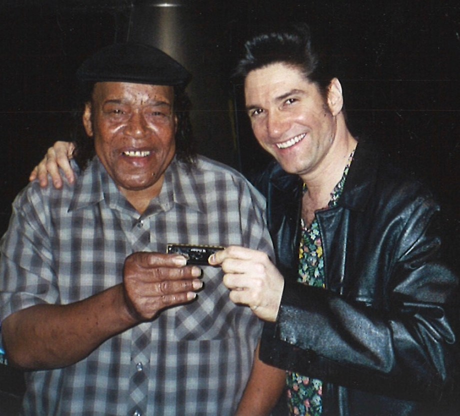 Bob Corritore reuniting with his longtime friend and harmonica mentor, Little Mack Simmons (Photo by Kim Cohen)