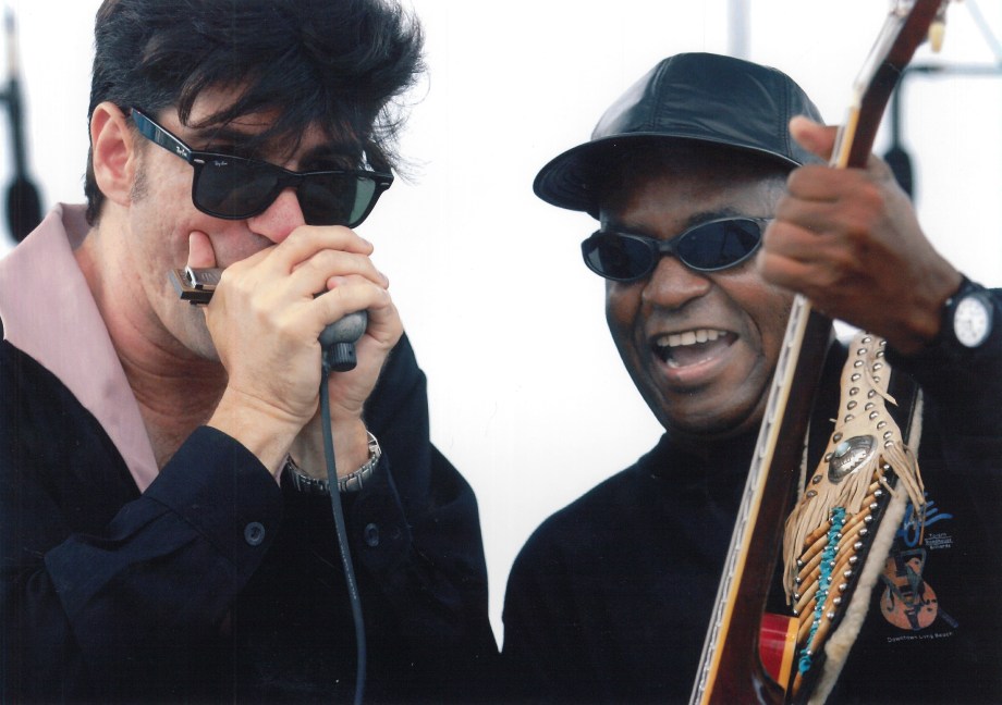 Bob Corritore & Arthur Williams clowning at the King Biscuit Blues Festival in Helena, Arkansas (Photo by Kim Danielson – 2004)