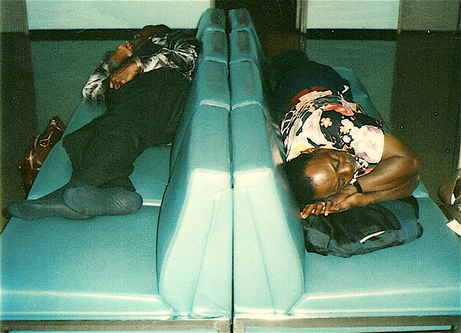 Muddy Waters and Pinetop Perkins catching a little sleep between flights at Charles de Gaulle Airport in Paris. Photo by Bob Margolin.