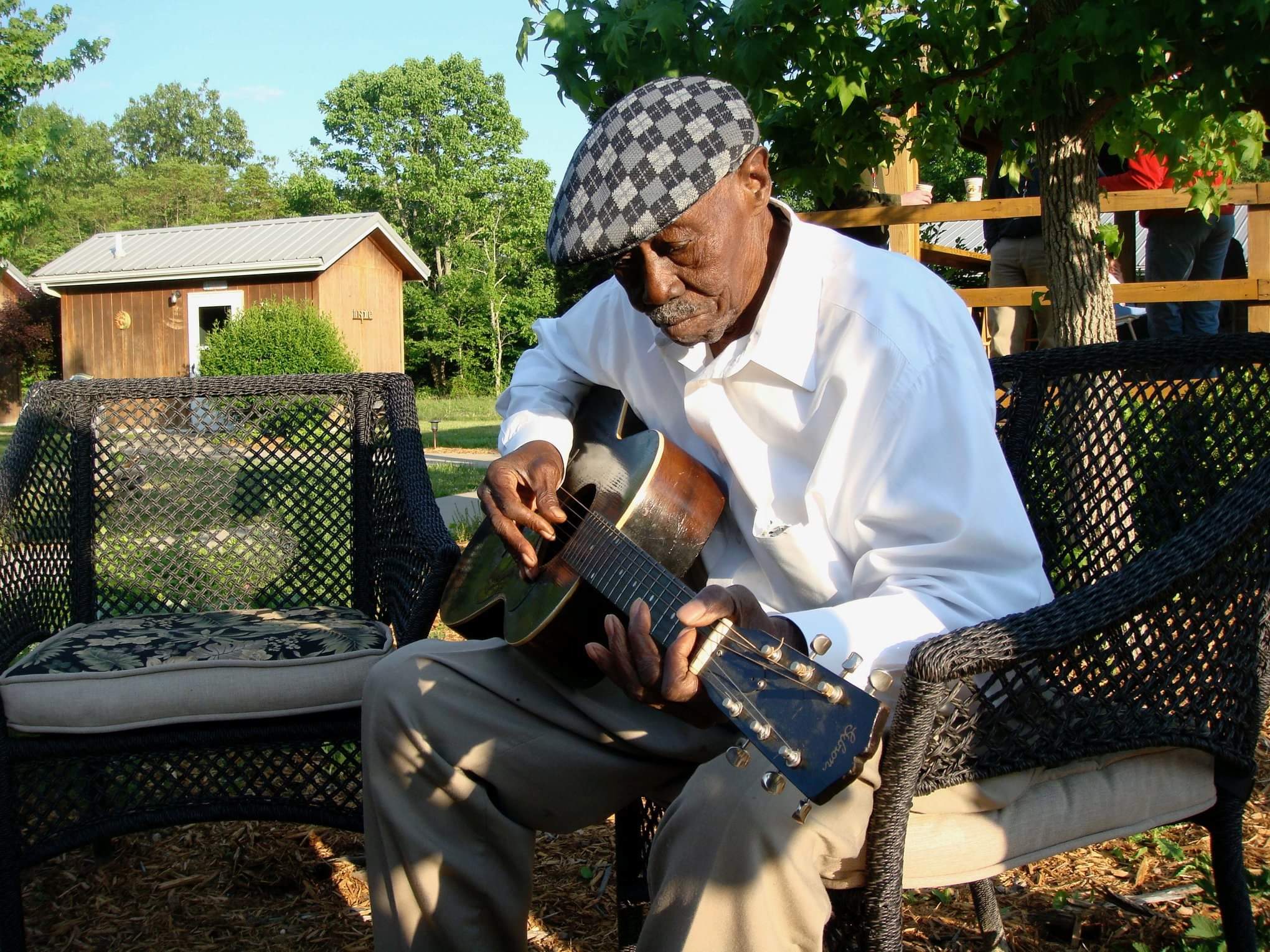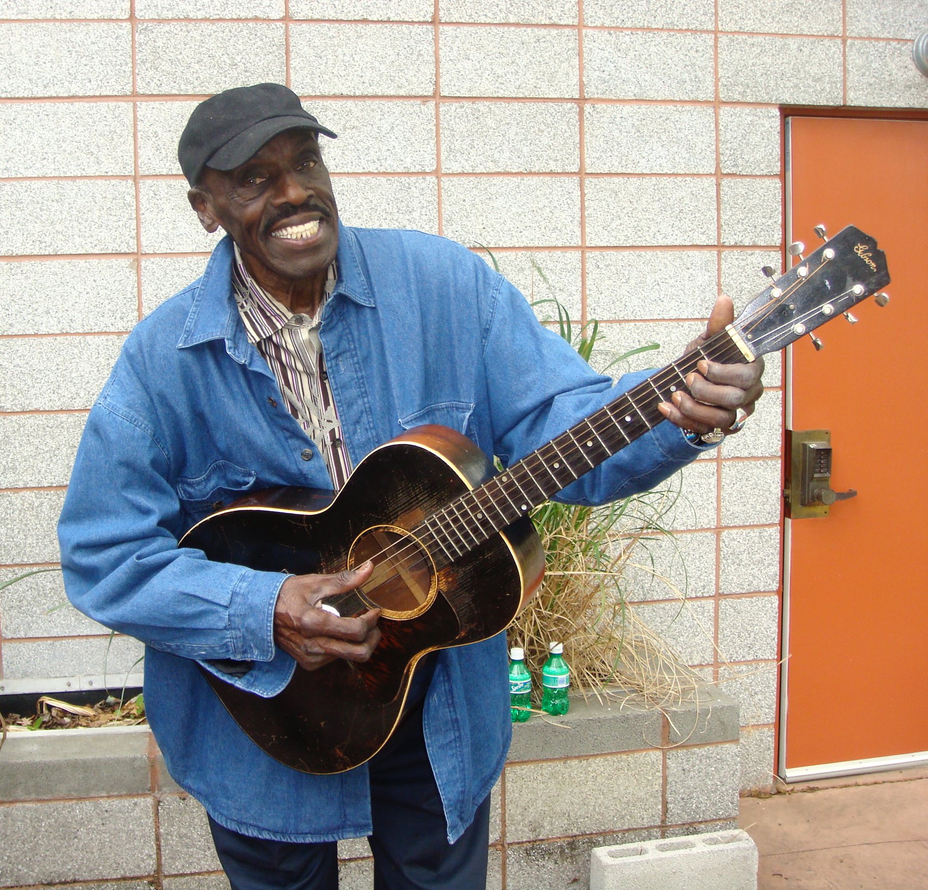 Nappy Brown playing Bob Margolin‘s acoustic guitar. Photo by Bob Margolin.