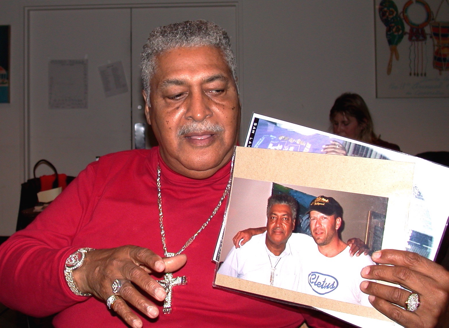 Sam Lay pulling up a photo of him and Bruce Willis. Photo by Bob Margolin.