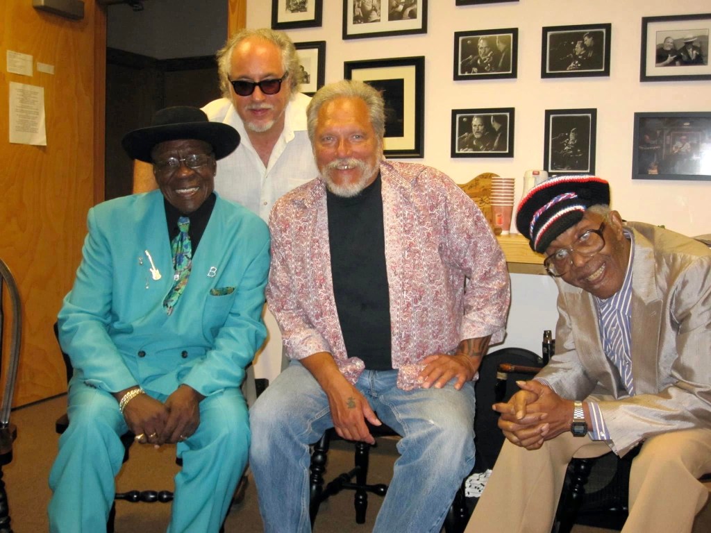 Bob Stroger, Bob Margolin, Jorma Kaukonen, and George Mojo Buford backstage at Jorma’s Fur Peace Station, August 14, 2010