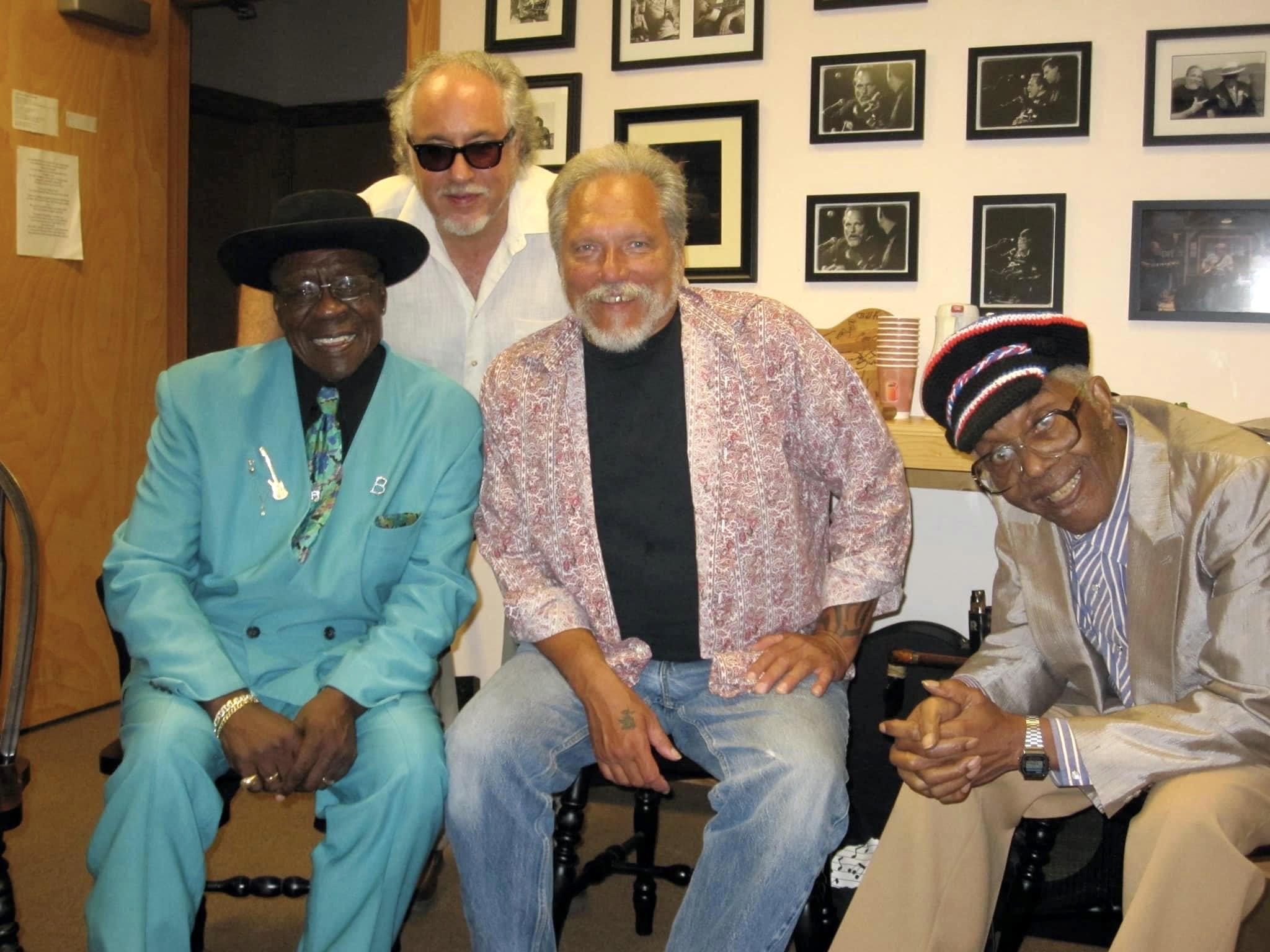 Bob Stroger, Bob Margolin, Jorma Kaukonen, and George Mojo Buford backstage at Jorma’s Fur Peace Station, August 14, 2010