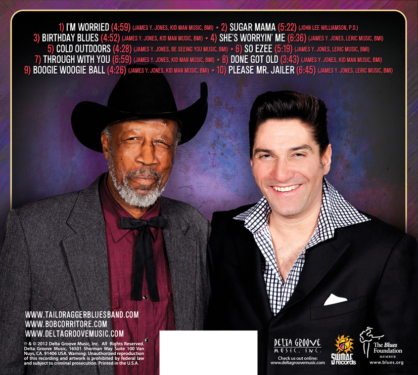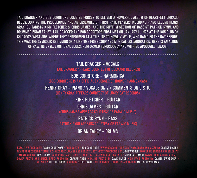 Tail Dragger and Bob Corritore combine forces to deliver a powerful album of heartfelt Chicago Blues. Joining the proceedings are an ensemble of first rate players including piano legend Henry Gray, guitarists Kirk Fletcher & Chris James, and the rhythm section of bassist Patrick Rynn, and drummer Brian Fahey. Tail Dragger and Bob Corritore first met on January 11, 1976 at the 1815 Club on Chicago’s West Side where they performed at a tribute to Howlin’ Wolf. who had died the day before. This was the symbolic beginning of a lifetime friendship and musical collaboration. Here is an album of raw, intense, emotional blues, performed ferociously and with no apologies. Here is the CD cover courtesy of graphic designer Josh Temkin with great photos by Dragan Tasic, Daniel Swadener, and Dave Blake.