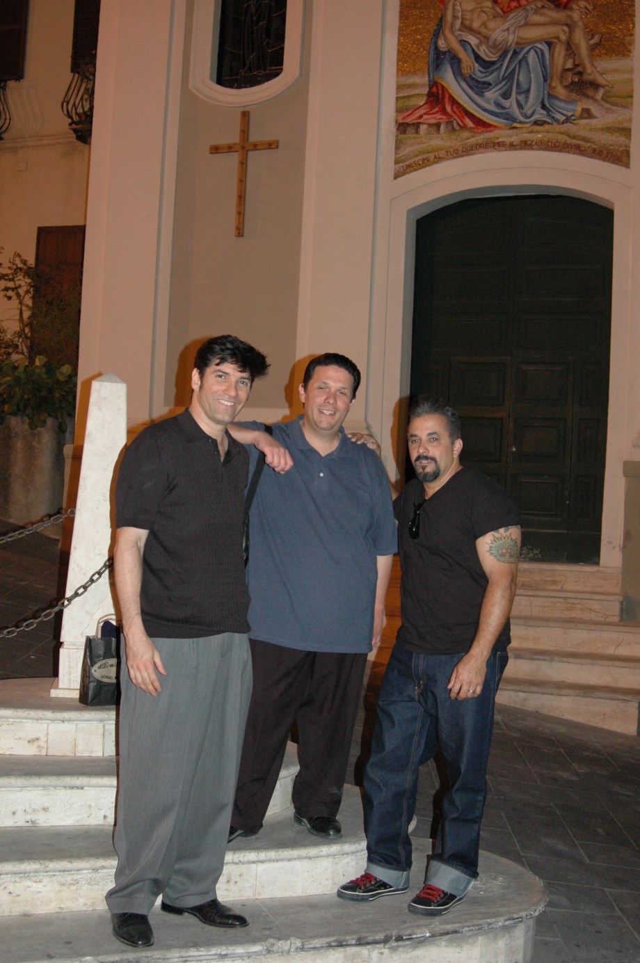 Bob Corritore, Chris James, Kid Ramos by the Byzantine Church in the old city of Rossano (Photo by Jocelyn Richez)