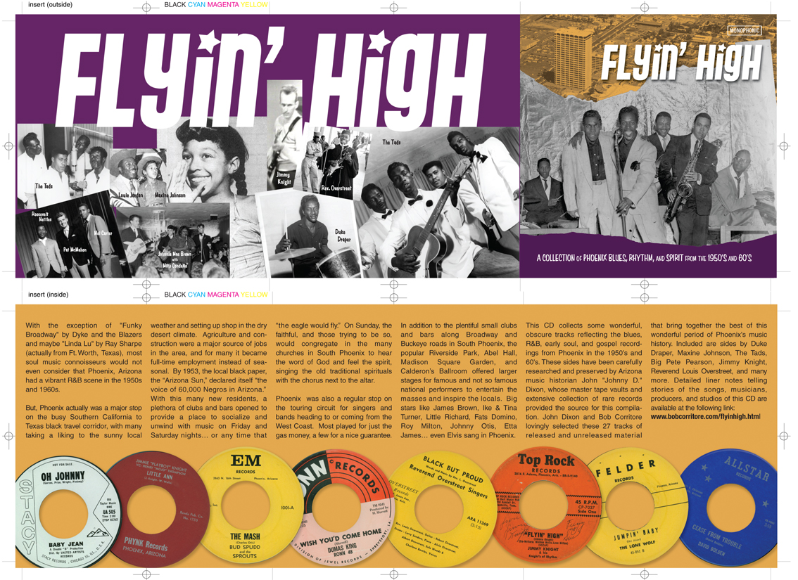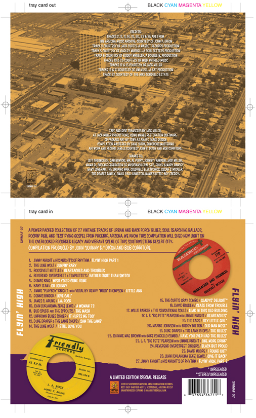 Various Artists – Flyin’ High CD Artwork This compilation presents a 27 song sampling of the glorious blues sides recorded in Phoenix, Arizona during the 1950s and 1960s. Artist photos from the archives of John Dixon and Bob Corritore. Artwork courtesy of Tony Amato of Amato Image Design. Johnnie Mae Brown With Mike Condello Maxine Johnson With Louis Jordan Maxine Johnson Roosevelt Nettles With Pat McMahon & Mel Carter Revered Louis Overstreet The Tads Next photo page Previous photo page Back to photo index Share this: Click to share on X (Opens in new window) X Click to share on Facebook (Opens in new window) Facebook Like Loading...