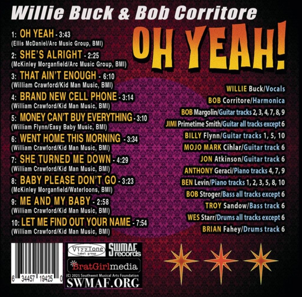 Willie Buck & Bob Corritore – Oh Yeah! CD Artwork Willie Buck & Bob Corritore / Oh Yeah!Release date, June 20, 2025. Graphic design by Jimi Giannatti. Next photo pagePrevious photo page Back to photo index Share this: Click to share on X (Opens in new window) X Click to share on Facebook (Opens in new window) Facebook Like Loading...